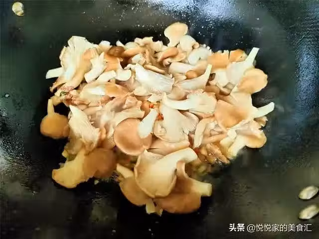 【第三步】:鍋留底油,放入蔥姜蒜末和小米辣炒出香味,然後倒入平菇翻拌均勻,再倒入沒過平菇的清水,再把草魚鋪在上面,蓋上蓋子燜煮10分鐘。
