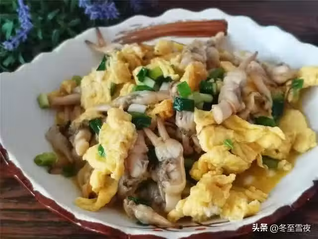 【蟶子炒雞蛋】所需材料:蟶子500克、雞蛋3個、油鹽適量、小蔥2棵、姜2片、白鬍椒粉1茶匙、料酒1湯匙、
