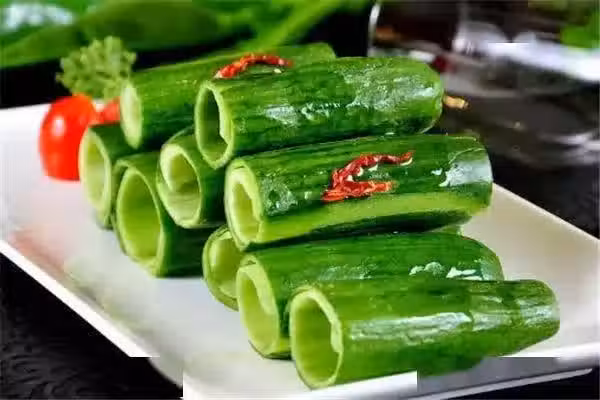 準備食材:黃瓜400克,辣椒(紅、尖、干)20克,姜25克,花椒15克,香油20克,醋30克,白砂糖30克,鹽5克。