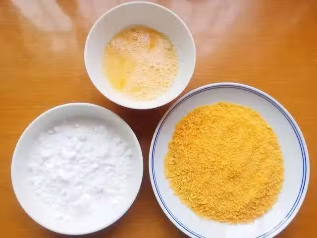 5、等雞胸肉腌制好後,按順序,依次裹上玉米澱粉、雞蛋液、麵包糠,裹麵包糠的時候,要用手按壓一下,這樣會裹得緊實一些