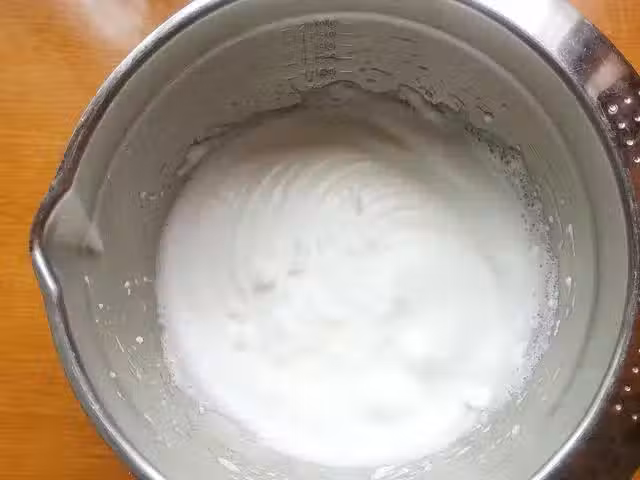 8、一直攪打到,提起打蛋頭,蛋白霜呈現硬挺的彎鉤狀即可,看下圖所示。溫馨提示,當加完最後一次細砂糖的時候,打發的中途要記得多次停下來,查看一下蛋白霜打髮狀態,避免打發過頭