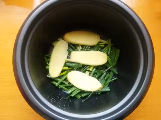 7、最後將雞放入電飯煲,再把腌雞時盆內殘留的腌料汁也倒入電飯煲內,然後蓋上蓋子,選擇煮飯按鈕,煮28分鐘,28分鐘後不要打開,利用餘溫再悶20分鐘即可。如果你的三黃雞比較大,請自動延長蒸的時間,想要判斷雞肉有沒有熟,最好的辦法就是用筷子插進雞肉里,沒有冒血水就可以了。