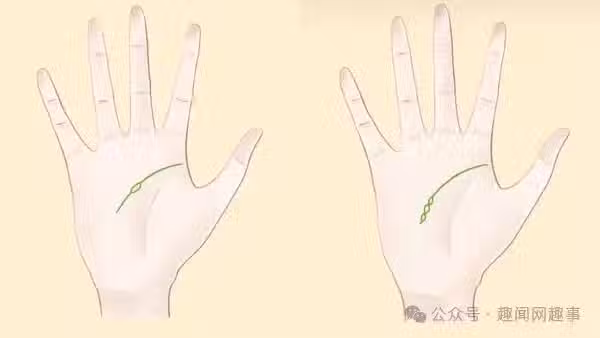 ◆ 感情線呈現「鏈條狀」:這樣的手相,表示個性比較多愁善感。