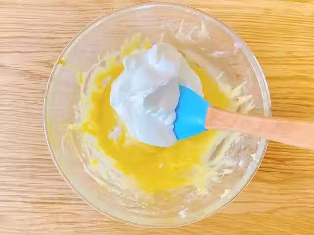 7、混合好後,再整個倒入剩餘的蛋白霜盆中,繼續用翻拌手法,混合均勻