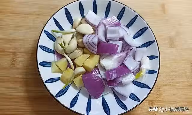 【步驟三】:鍋中放一勺油燒熱,開小火把蔥姜蒜一起倒入鍋中,煎炸出香味,蔥姜蒜有點變色撈出來備用。