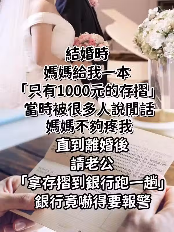 結婚時,媽媽給我一本「只有1000元的存摺」,當時被很多人說閒話,媽媽不夠疼我,直到失婚後,請老公「拿存摺到銀行跑一趟」,銀行竟嚇得要報警~