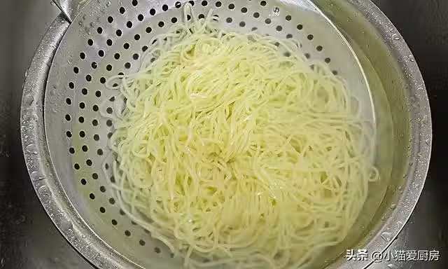 【步驟五】:把瀝干水分的麵條,倒入老抽1勺、1勺植物油,攪拌均勻備用。