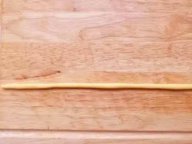 6、然後將搓好的長條從右往左捲起來,盤成一個圓,如下圖所示,尾部收口處的地方建議抹上少許水,這樣收口處會更服帖,不易散開。