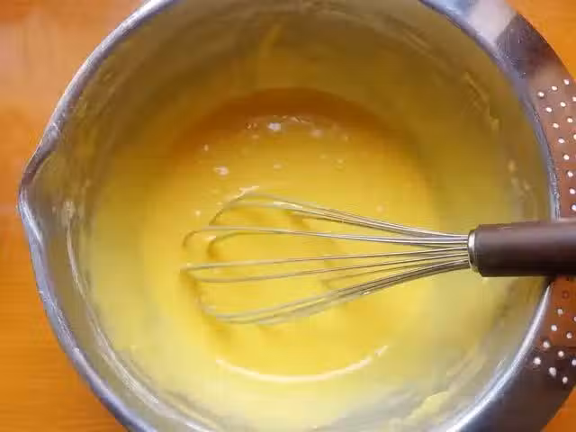 5、倒入融化的黃油液,繼續用手動打蛋器攪打均勻,一定要將黃油液和麵糊充分混勻