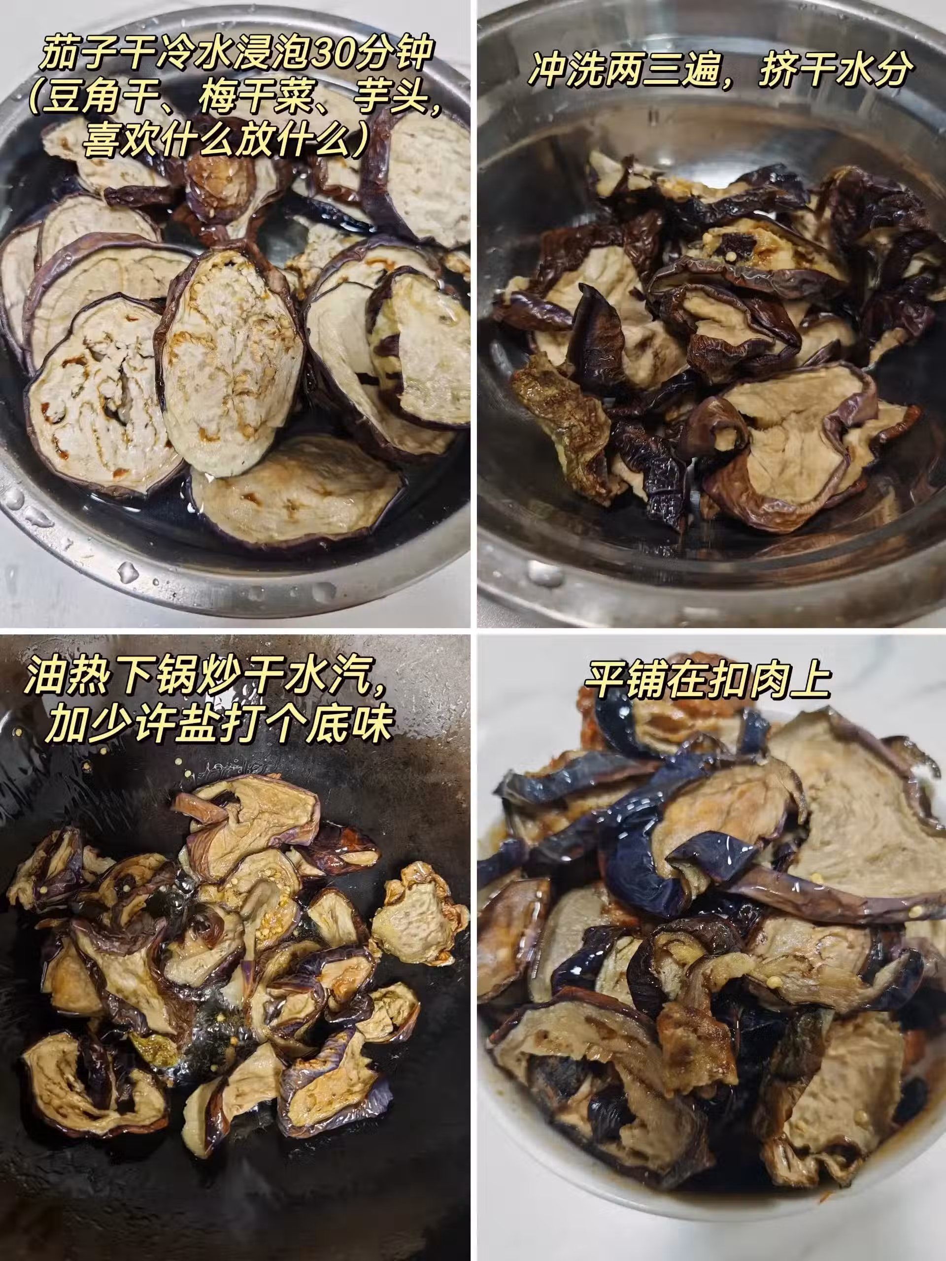 2、茄子乾得先用冷水浸泡30分鐘,再沖洗2-3遍,擠干水分;然後再加少許鹽炒干水汽,均勻鋪在五花肉上;打底菜可是最受歡迎的,因為它吸收了肉的精髓,一上桌就被搶光!