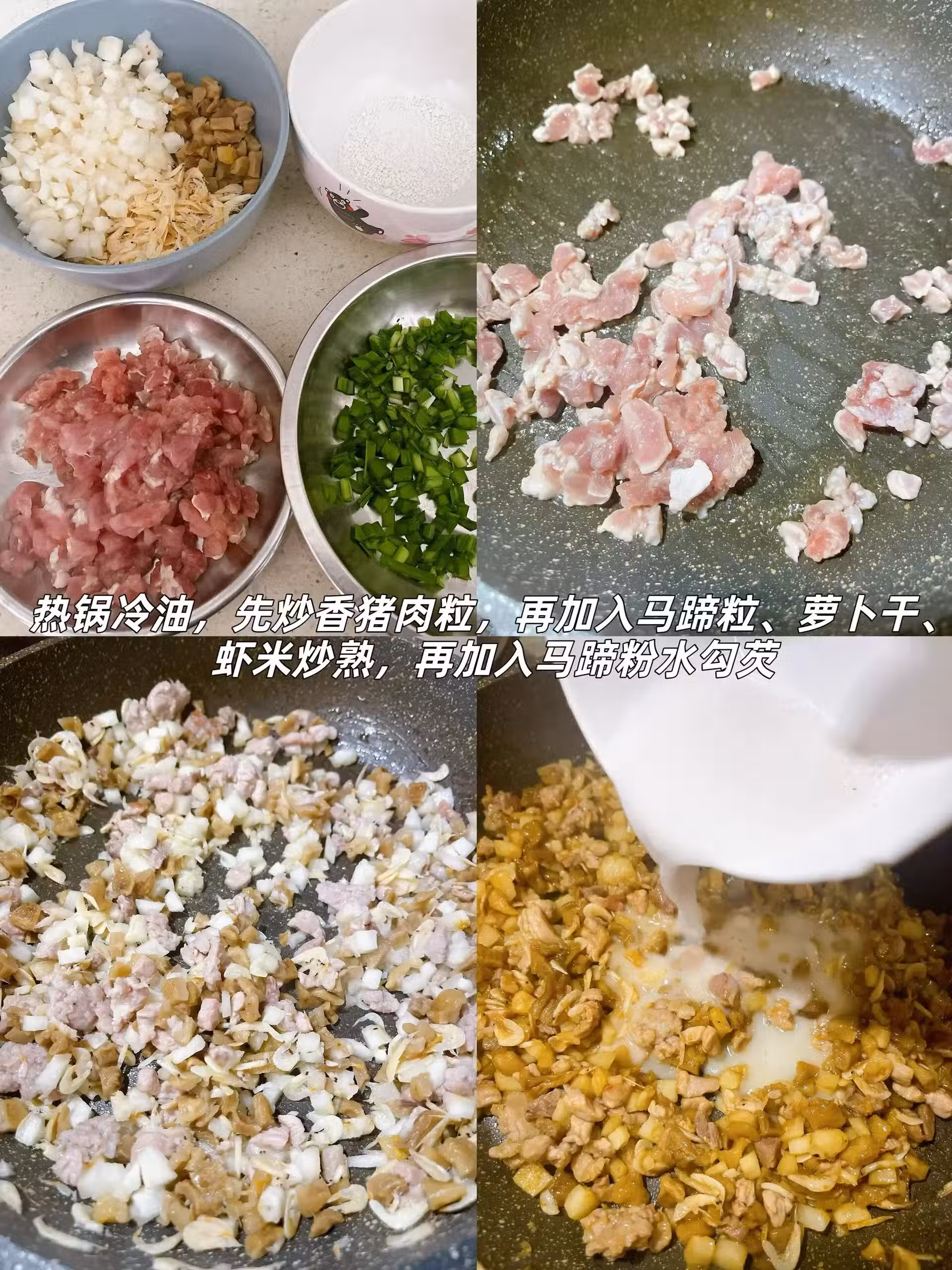 5、熱鍋涼油,先放入豬肉粒煸炒至變色,再加入蘿蔔乾、馬蹄和蝦米一同炒香;這時適量的鹽和生抽便是最佳的調味伴侶。最後用馬蹄粉勾個薄芡,讓餡料更加濃郁可口。關火後,拌入韭菜碎,餡料便大功告成。