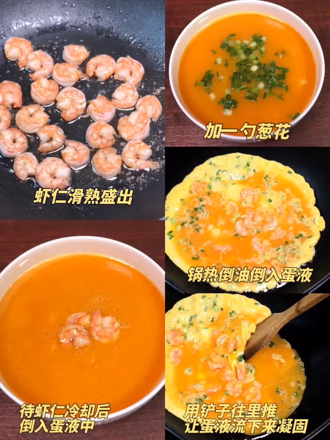 將煎好的蝦仁滑蛋放入盤中,用鏟子輕輕整理成完美的圓形或方形。再撒上一些蔥花點綴,增添一絲綠意