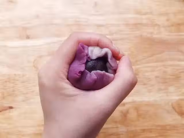 18、包好餡料後,將收口處朝下,再用雙手將紫薯酥整理的圓潤一些。另外大家在包餡料的時候,手儘量不要觸碰到外皮的螺旋紋部分,碰花了的話,烤好的成品層次會不明顯。此時烤箱預熱180度上下火