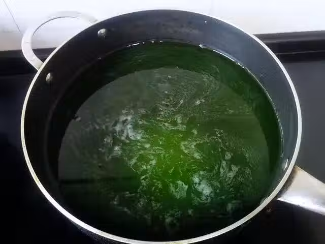 6、然後加入40克的冰粉粉,轉中火,邊煮邊攪拌,煮到鍋內液體微微冒小泡泡,就可以熄火了,熄火後,我們再倒入200克的蘇打汽水,攪拌均勻。