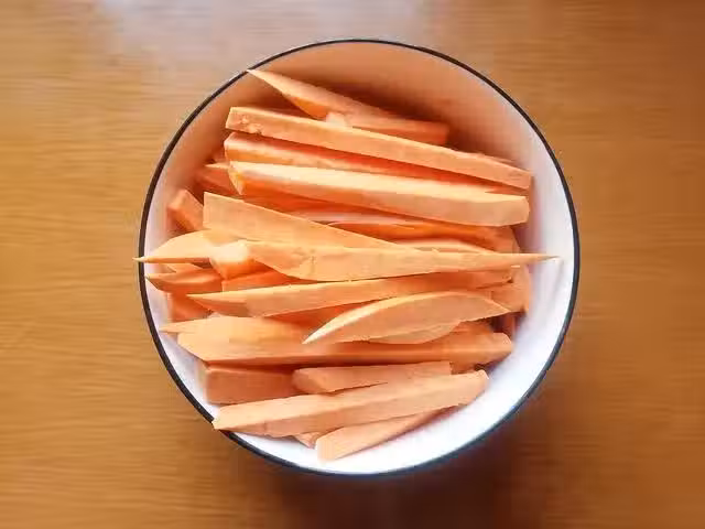 2、接著將切好的紅薯條鋪在蒸籠里,蒸籠最好事先墊上油紙或者蒸籠布,避免蒸熟的紅薯粘在上面取不下來,紅薯條通常大火上汽後,再蒸8~10分鐘就可以了。