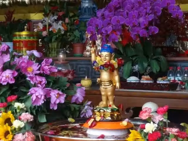 (4)、安座沐浴。大殿內鐘鼓齊鳴,迎像隊伍到達後,主法者將太子像安放在香湯盆內,鐘鼓、佛號停止。