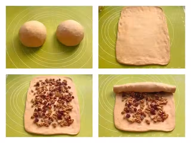 4、鋪好過果乾以後,用手略壓一下,然後由上至下捲起來,每卷一卷都要壓緊實,捏緊收口,然後再把卷好的麵包胚子滾圓,表面凹凸的地方按壓平滑。