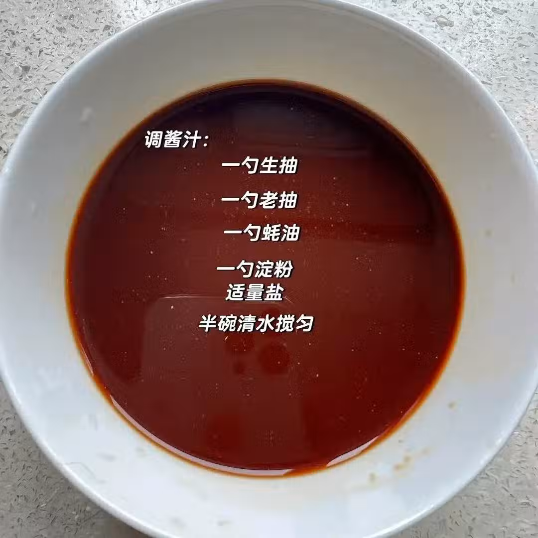 接下來調制醬汁,將一勺生抽、一勺老抽、一勺蠔油、適量的鹽、一勺澱粉和半碗清水攪勻,這樣不僅能提升肉末的味道,還能使得菜肴更加入味。