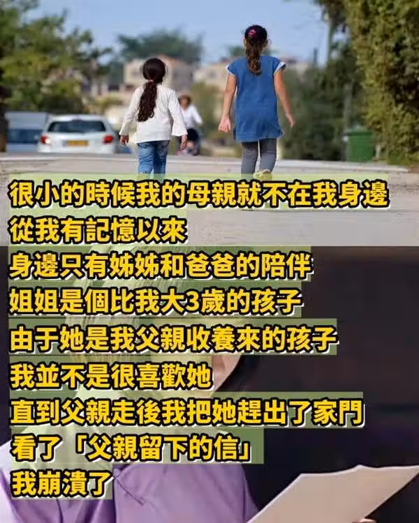 很小的時候我的母親就不在我身邊,從我有記憶以來身邊只有姊姊和爸爸的陪伴。姐姐是個比我大3歲的孩子, 由於她是我父親收養來的孩子我並不是很喜歡她。直到父親走後我把她趕出了家門,看了「父親留下的信」我崩潰了~
