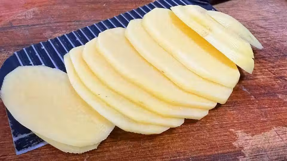 2、鍋內水燒開後,下入土豆片,大火煮沸,煮1分鐘左右,看到土豆變色,即可撈出。注意不要煮得太熟,太軟爛就曬不成土豆乾了,焯水的作用就是去除一下生味和防止晾曬的過程發黑。