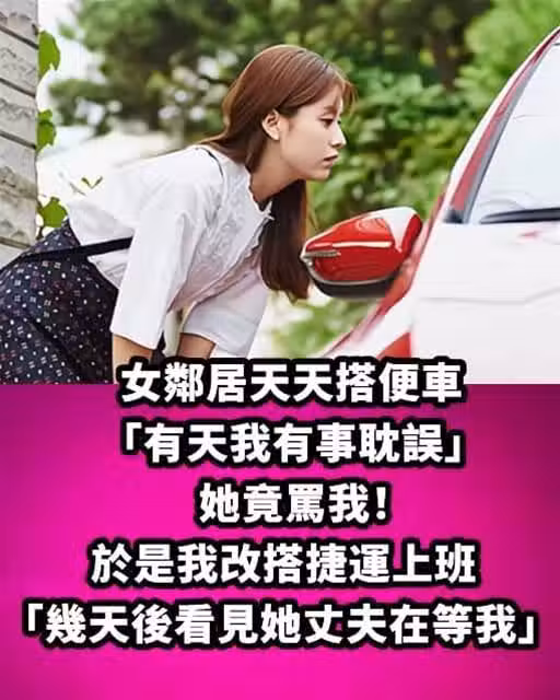 女鄰居天天搭便車「有天我有事耽誤」她竟罵我!於是我改搭捷運上班「幾天後看見她丈夫在等我!」