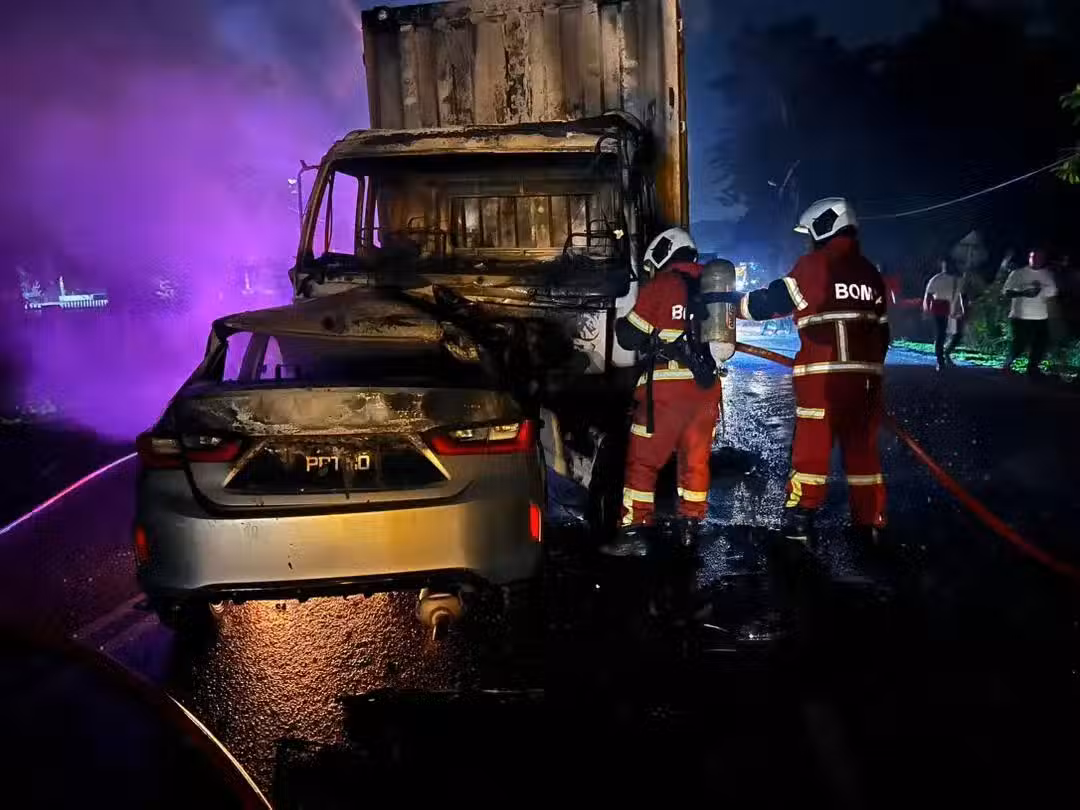 (萬撓7日訊)萬撓於今早發生恐怖車禍,一輛轎車與拖格羅里相撞後起火燃燒,導致車中男女被活活燒死。