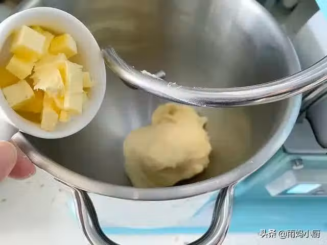 4、把黃油揉進麵糰里,切下一小塊麵糰,用手撐開能拉出面膜即可。