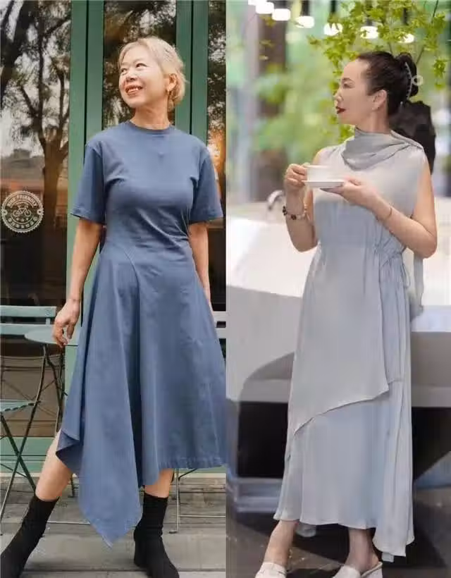 與其如此,還是更建議大家穿純色款,素色長裙就是氣質中年女性的首選,顏色低調簡約,飽和度不高,即便是布滿全身也不會顯得俗氣誇張。