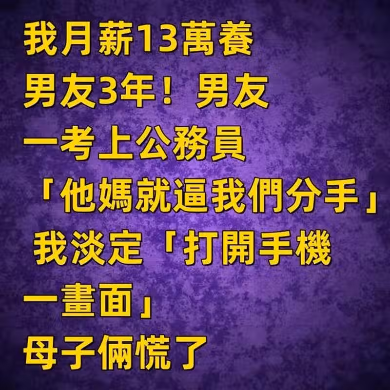 我月薪13萬養男友3年!男友一考上公務員「他媽就逼我們分手」 我淡定「打開手機一畫面」母子倆慌了~