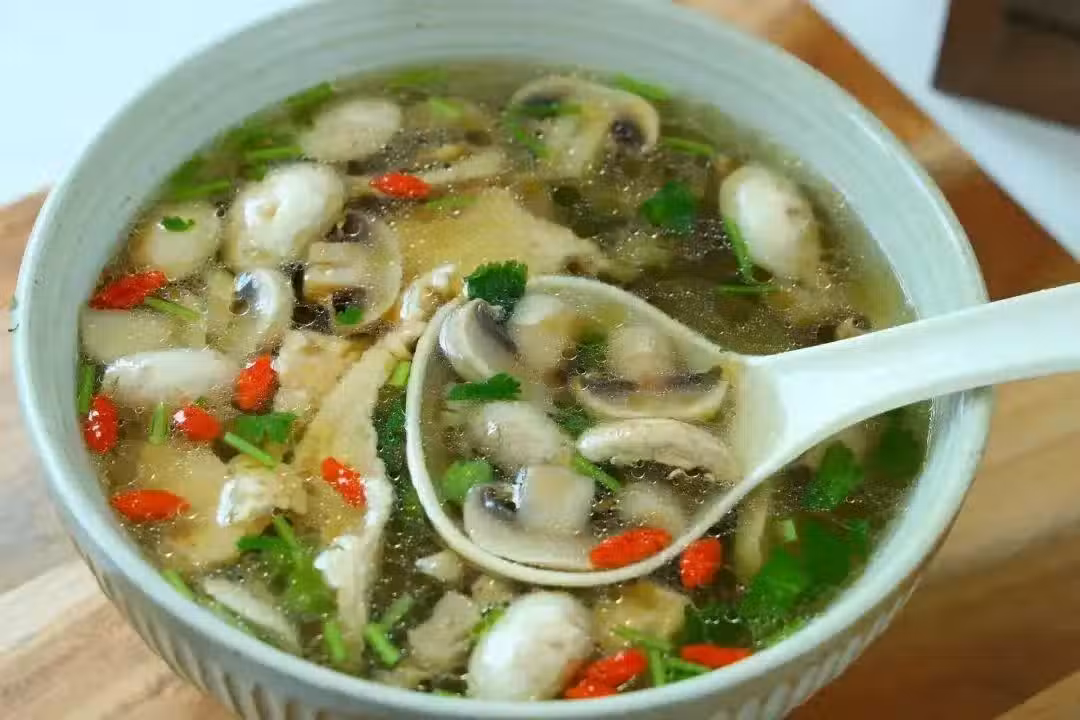 隨著火候的慢慢升溫,雞胸肉和口蘑的香氣逐漸釋放,與豌豆的清新相互交融,形成了一種獨特的香味。出鍋前,撒上一些香菜和枸杞,不僅為這道湯增添了色彩,還豐富了其口感和營養。香菜以其特有的香氣和味道為這道湯畫上了完美的句號,而枸杞則以其滋補的功效為這道湯注入了健康的氣息。