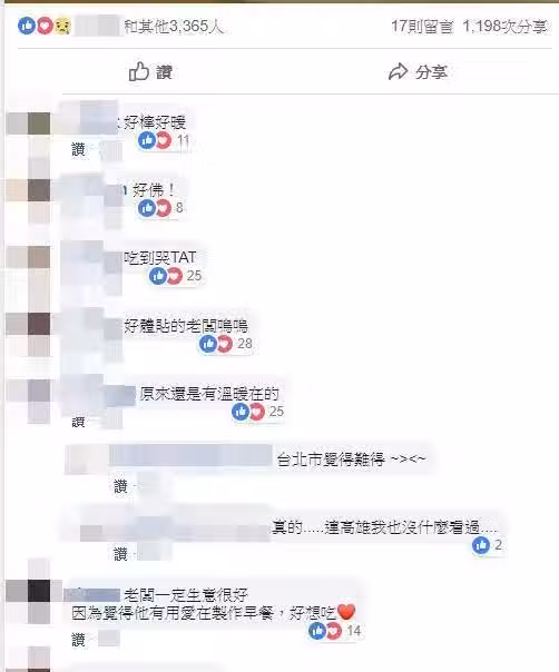 短短一句話充滿了正能量,讓他忍不住PO上網,傳遞這份溫暖。而網友們看到後,也都紛紛留言表示「超暖心的,祝老闆好心好報、生意興隆」、「嗚嗚嗚,老闆好人,一生平安」、「很棒的早餐店,給了幫助,也給了尊嚴」。