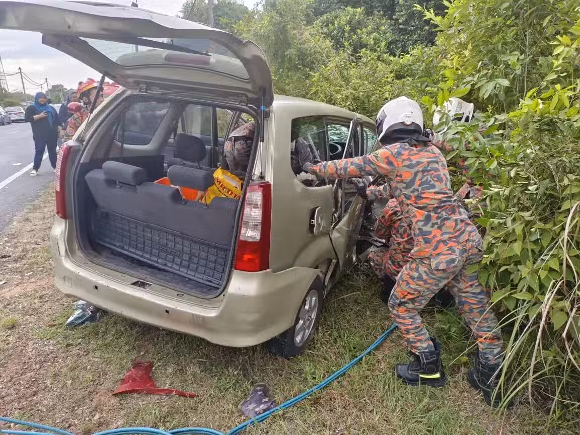 (哥打丁宜7日訊)一輛豐田休旅車行駛途中故與一輛寶騰賽佳轎車迎面相撞,造成休旅車58歲女司機當場被夾斃,賽佳轎車上一家三口受傷入院。