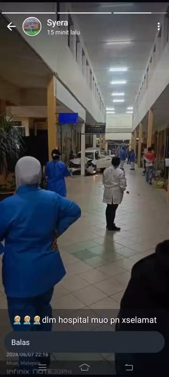 麻坡蘇丹後法蒂瑪專科醫院發生罕見意外,轎車失控撞入醫院大廳走廊。