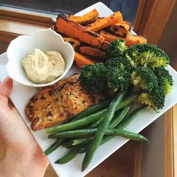 午餐:烤地瓜條+水煮花椰菜+水煮四季豆+烤鮭魚+薯泥