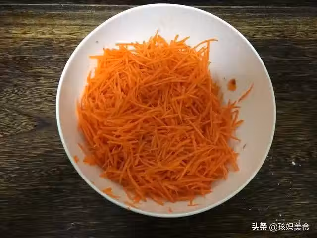 1、胡蘿蔔去皮用擦子擦成細絲,最好用細一點的擦子,擦出的絲好吃也好熟。