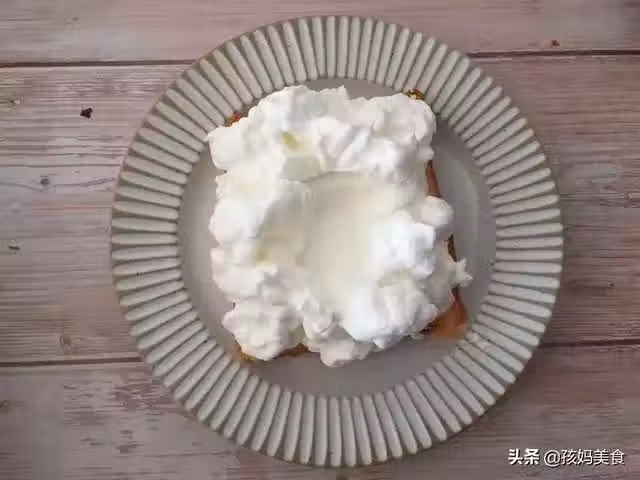 5、把蛋白塗到吐司片上,休整成雲朵的形狀,中間用勺子壓出一個圓坑。