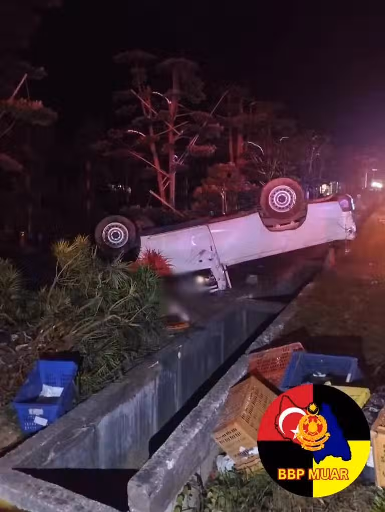 華裔僱主駕駛的貨卡疑失控撞向路肩翻覆,路邊還有散落一地的籃子。