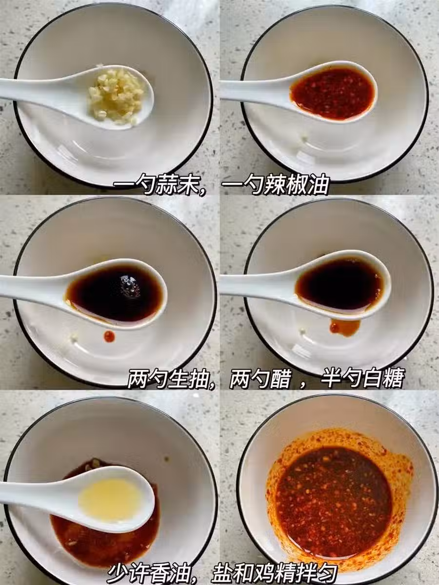首先,準備食材:新鮮黃瓜一根切成細絲,熟花生米適量,以及你鐘愛的面條。接下來,開始製作關鍵的醬汁,這是調出美味涼面的靈魂所在。準備勺蒜末,一勺辣椒油,兩勺生抽,兩勺醋,少許香油和半勺糖,然後加入適量的鹽和雞精攪拌均勻。調好的醬汁既有辣椒油帶來的微辣,又有醋和糖的鮮香,特別開胃。