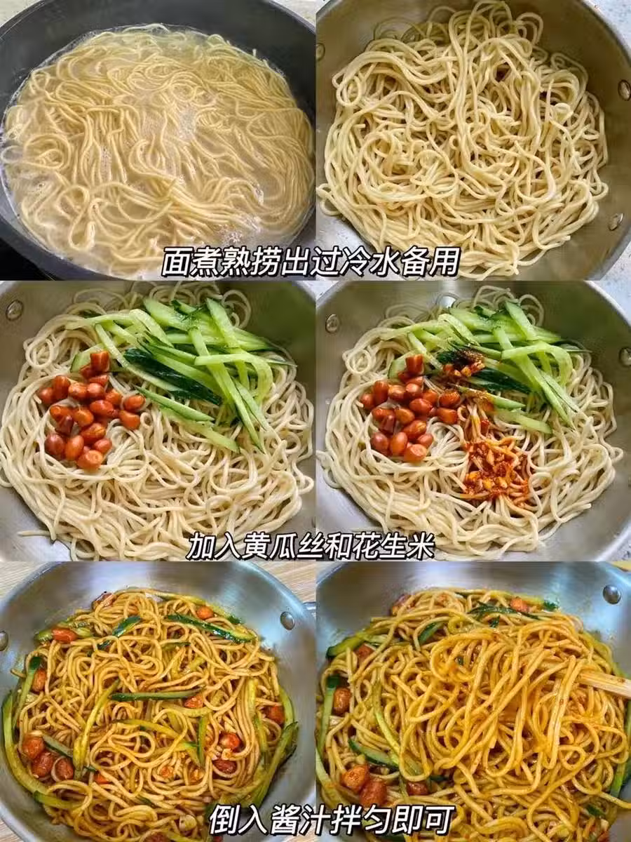 接下來的步驟十分簡單,把面條煮熟後撈出,放入涼水中過一下冷水,以保持面條的勁道和爽滑。將面條撈出瀝干水分,加入事先準備好的黃瓜絲和熟花生米,直接淋入調好的醬汁,攪拌均勻後即可享用這道清爽美味的涼面了。