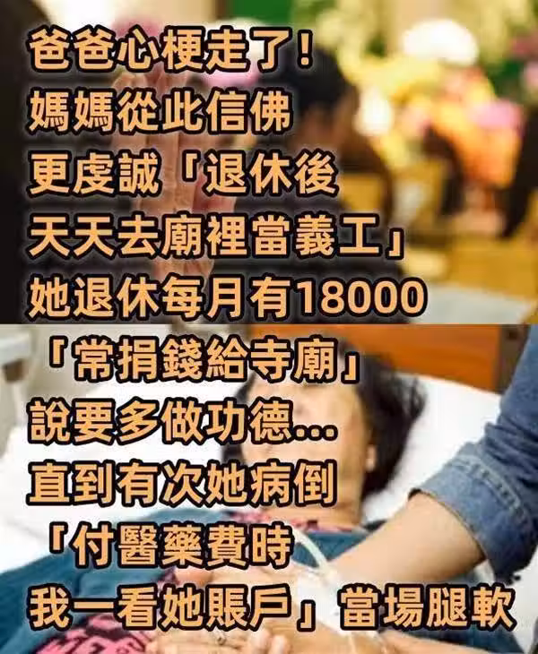 爸爸心梗走了!媽媽從此信佛更虔誠「退休後天天去廟裡當義工」,她退休每月有18000「常捐錢給寺廟」說要多做功德… 直到有次她病倒「付醫藥費時我一看她的賬戶」當場腿軟了…