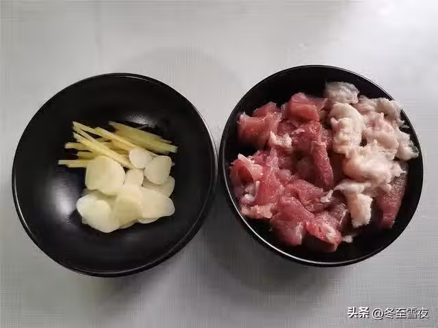 3.豬肉選用五花肉,或者有肥有瘦的豬肉,炒出的菜肴味道香,把豬肉切成片。姜切絲,大蒜切片。
