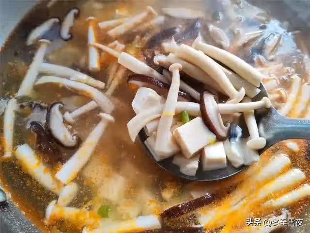 7.把焯好水的海鮮菇,香菇和豆腐,一起下入鍋內,燒開後煮1-2分鐘。