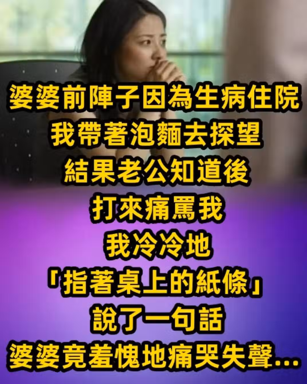 婆婆前陣子因為生病住院,我帶著泡麵去探望,結果老公知道後打來痛罵我,我冷冷地「指著桌上的紙條」說了一句話,婆婆竟羞愧地痛哭失聲~