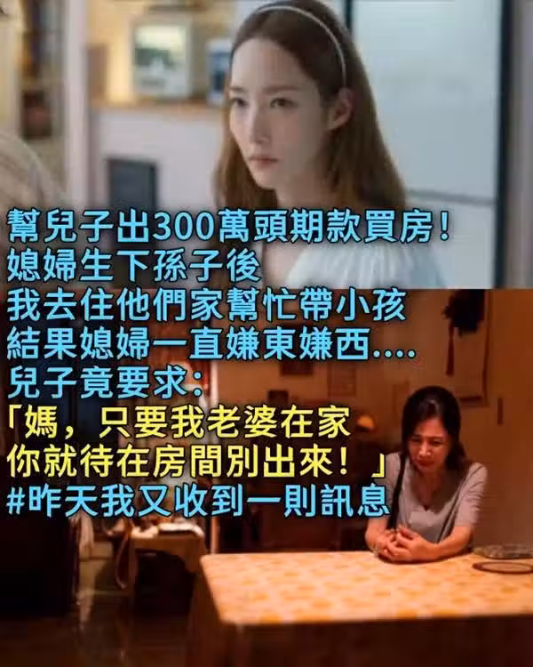 幫兒子出300萬頭期款買房! 媳婦生下孫子後我去住他們家幫忙帶小孩,結果媳婦一直嫌東嫌西....兒子竟要求:「媽,只要我老婆在家,你就待在房間別出來!」#昨天我又收到一則訊息