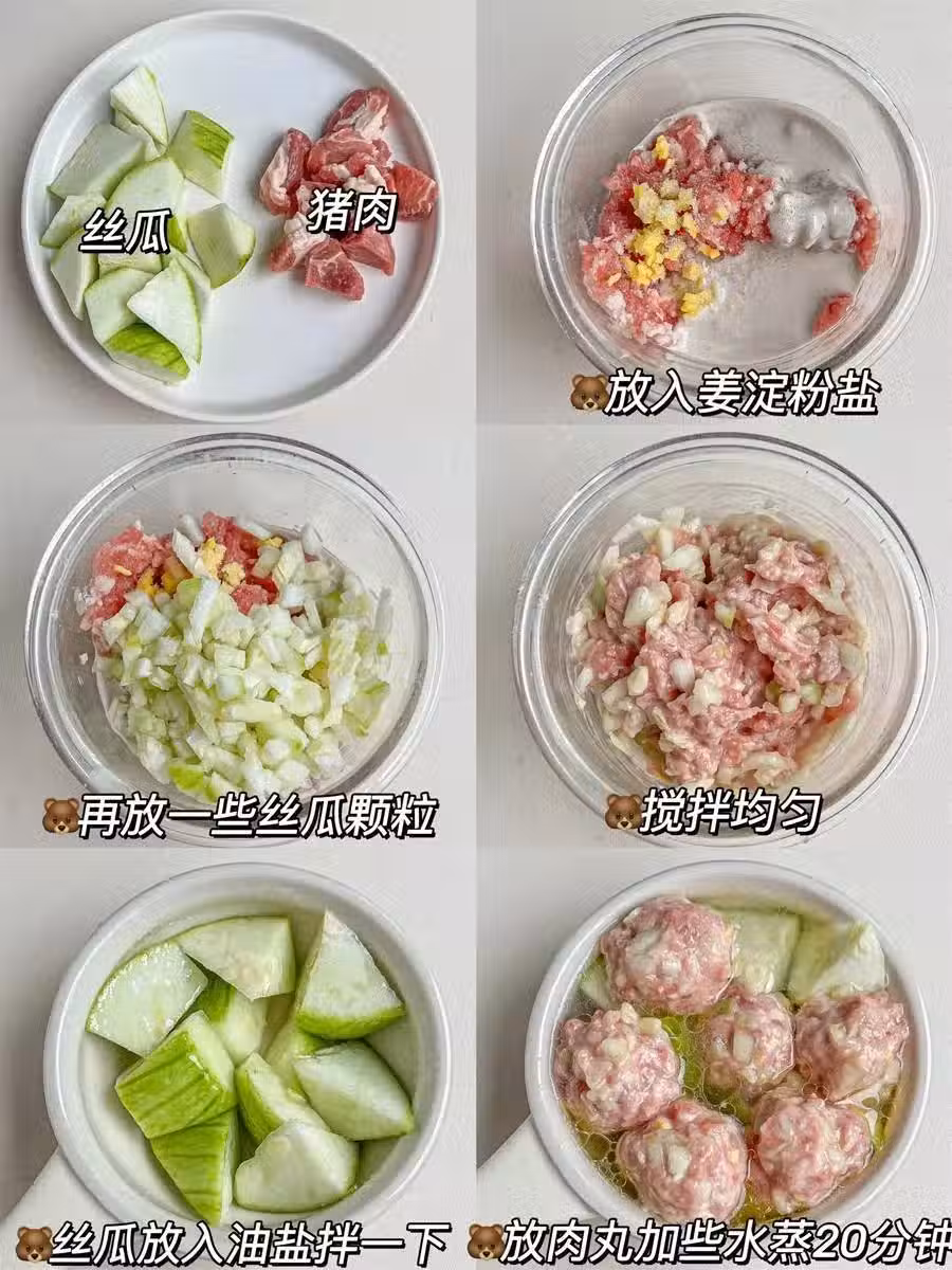 4.組裝和蒸製:在碗底鋪上處理好的絲瓜塊,然後將攪拌均勻的豬肉團成小球,放在絲瓜上。最後,加入適量的水,蓋上蓋子,用中火蒸約20分鐘。