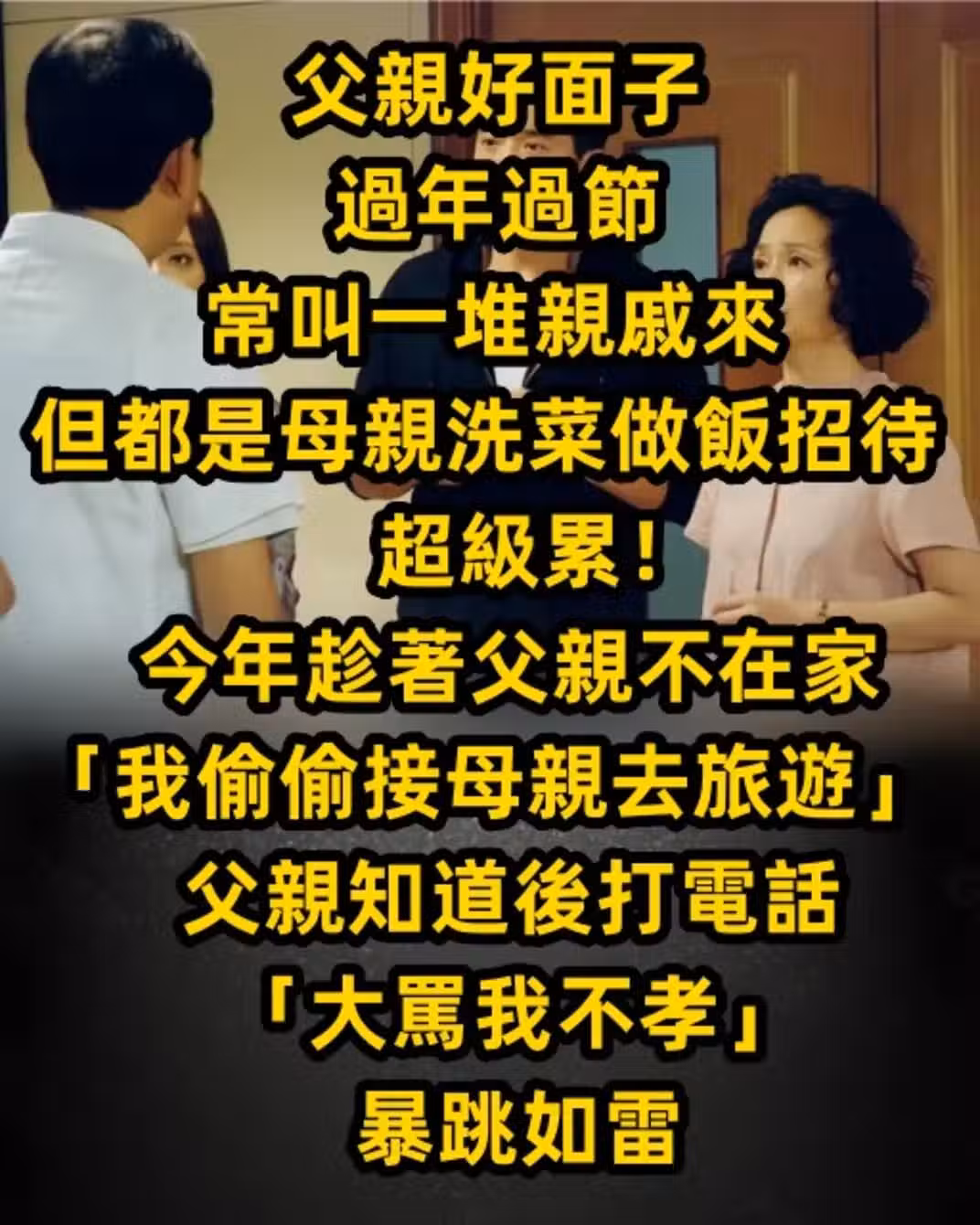 父親好面子、過年過節常叫一堆親戚來,但都是母親洗菜做飯招待,超級累!今年趁著父親不在家「我偷偷接母親去旅遊」 父親知道後打電話「大罵我不孝!」