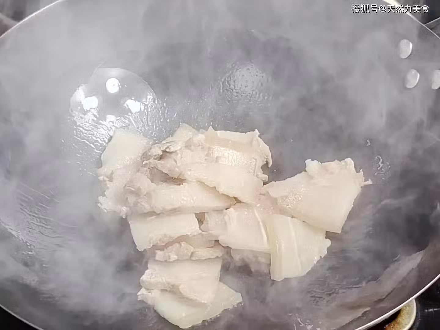 15、一般來說回鍋肉的標準,就是把五花肉炒到燈盞窩狀就可以,但是我喜歡把回鍋肉炒老一些,這樣更不油膩也更香,具體的老嫩程度可以根據自己的喜好來定。