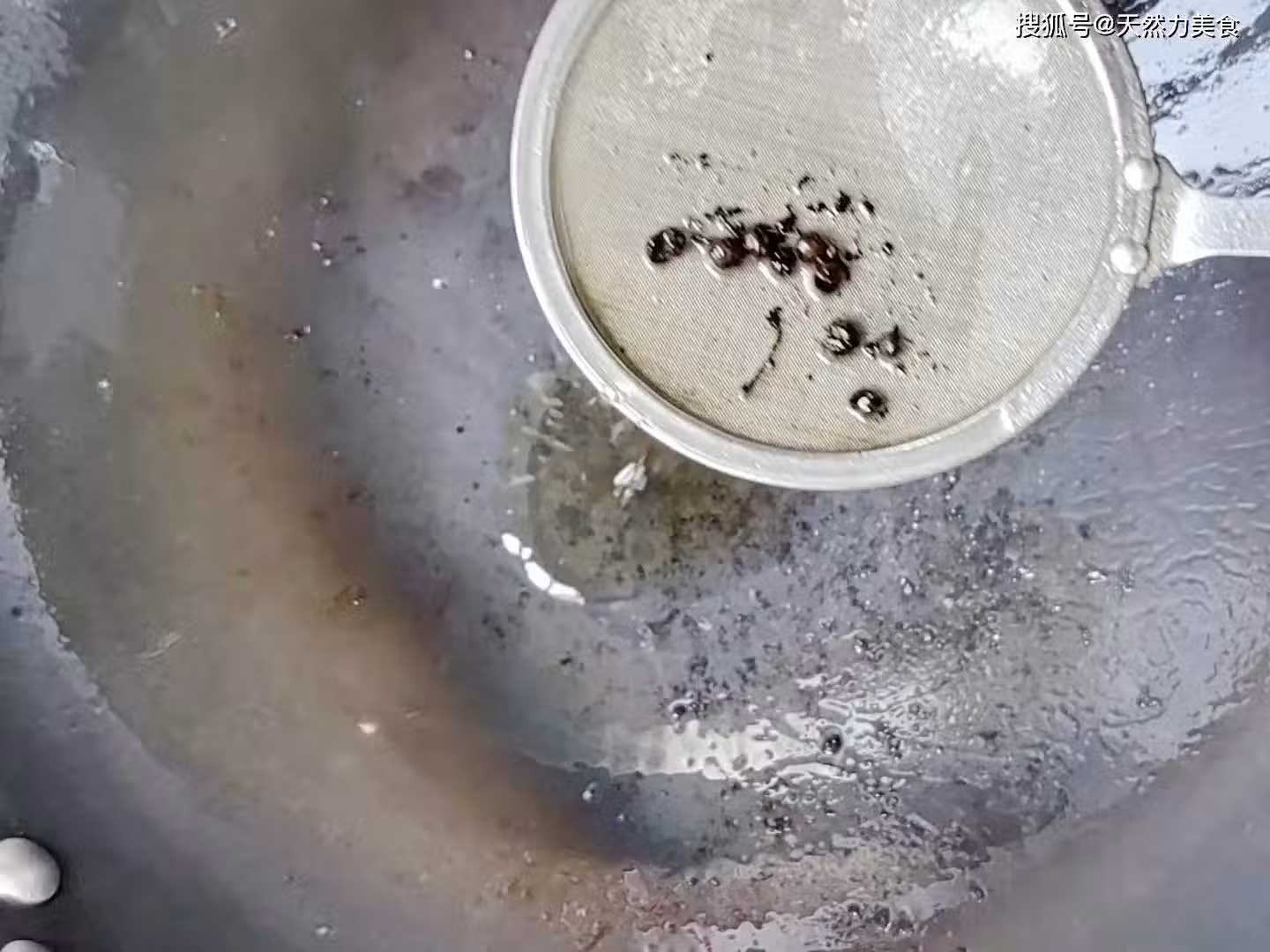 5、把花椒打出後就改小火,把洋蔥和肉片一起倒入鍋內,接著加入3克食用鹽,2克雞精,3克香醋(加醋可以讓洋蔥的口感更脆),15克生抽,3克老油,10克蚝油,翻炒均勻,把調味料炒勻。大概炒上15秒左右就可以。