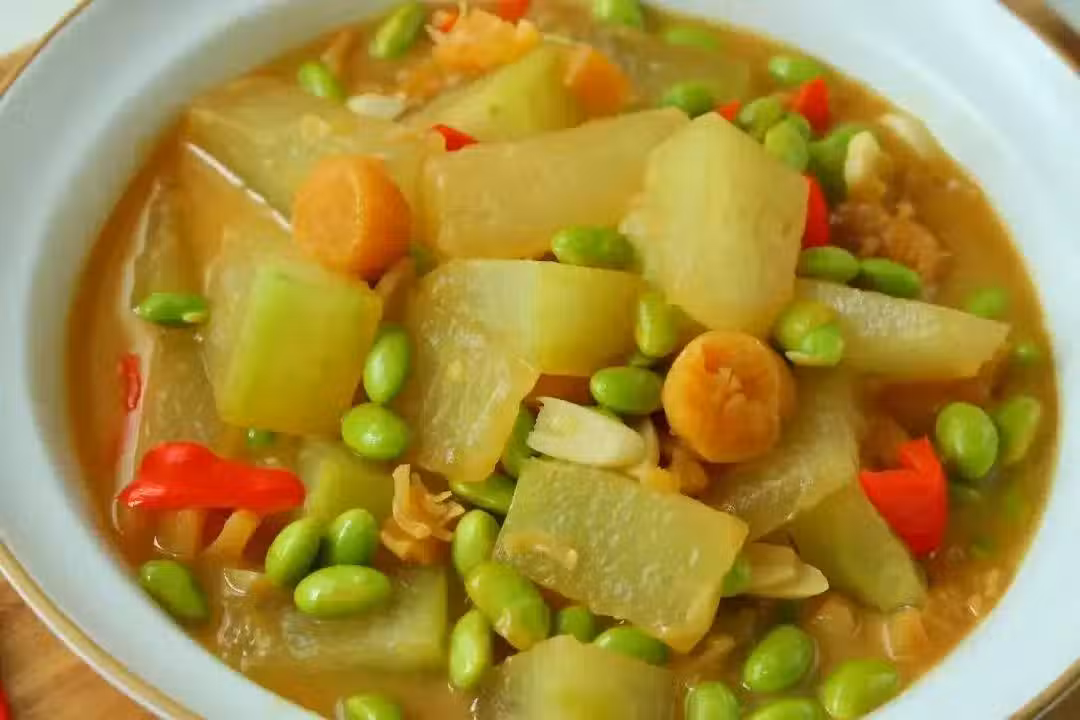 製作配料:冬瓜1塊 乾貝1把 毛豆100克 紅椒半個 生抽2勺 鹽半勺 老抽半勺 水澱粉少量 大蒜2個