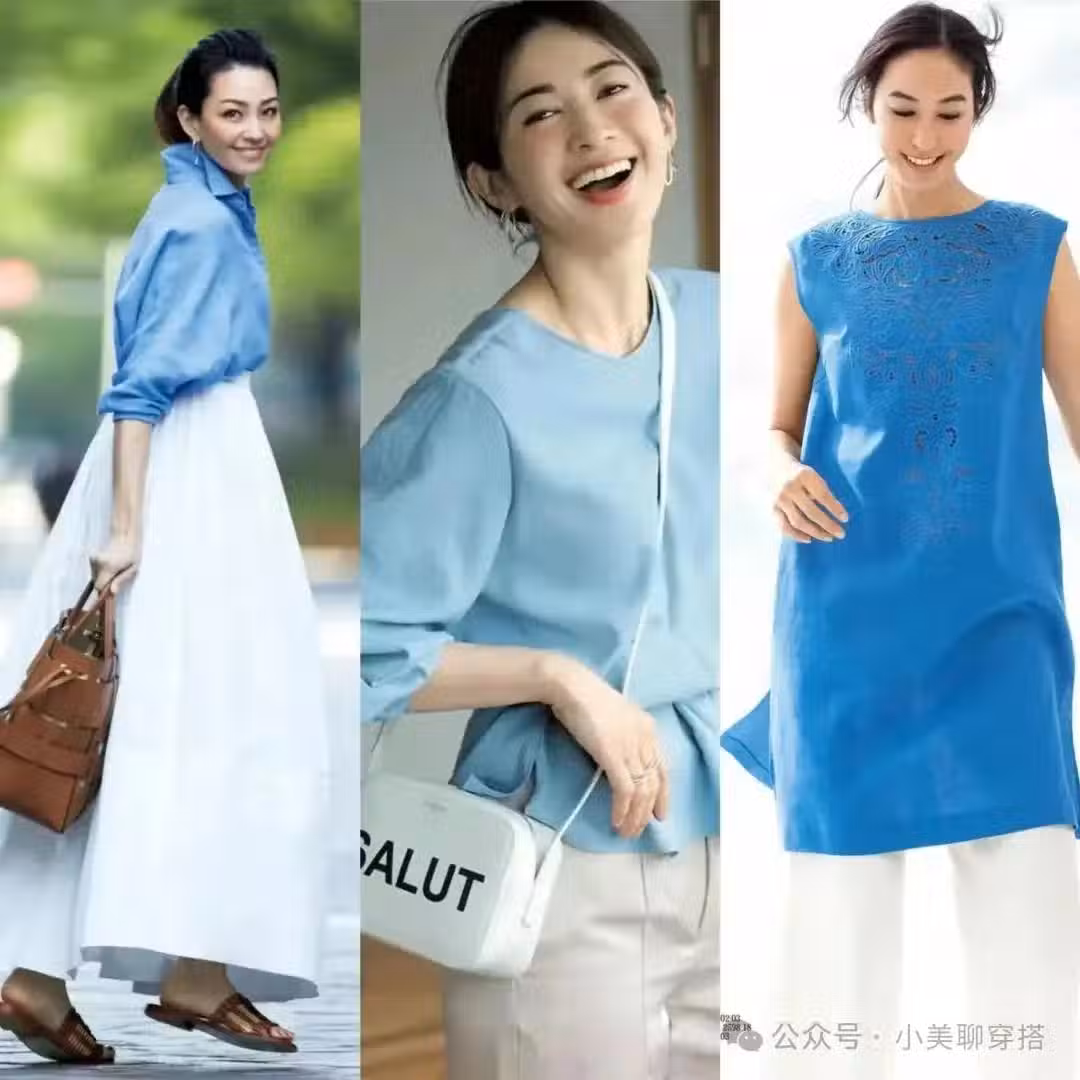 水藍色與白色的搭配最為養眼,就像是藍天白雲般的清澈寧靜,很適合40、50歲的女生,顯得乾淨優雅,充滿了高級感。